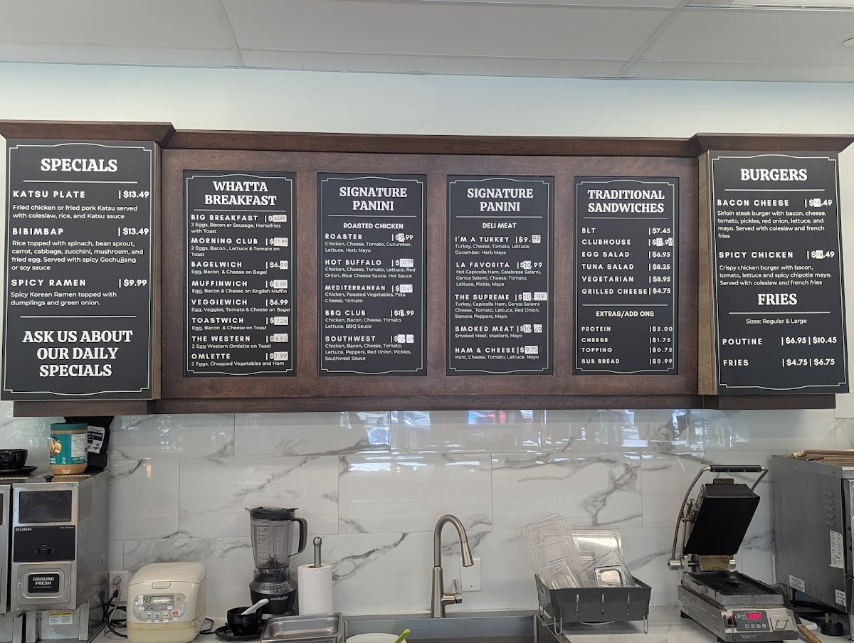 The menu at Whatta Sandwich Deli and Catering Co. offers a range of options suitable for lunch and light meals. Visitors can expect a variety of sandwiches, salads, and wraps, along with offerings that include Korean-inspired dishes such as bulgogi and chicken katsu plates. Portions are designed to be practical for quick lunches. The menu also includes daily specials, home-baked pastries, cookies, and a selection of coffee and tea.